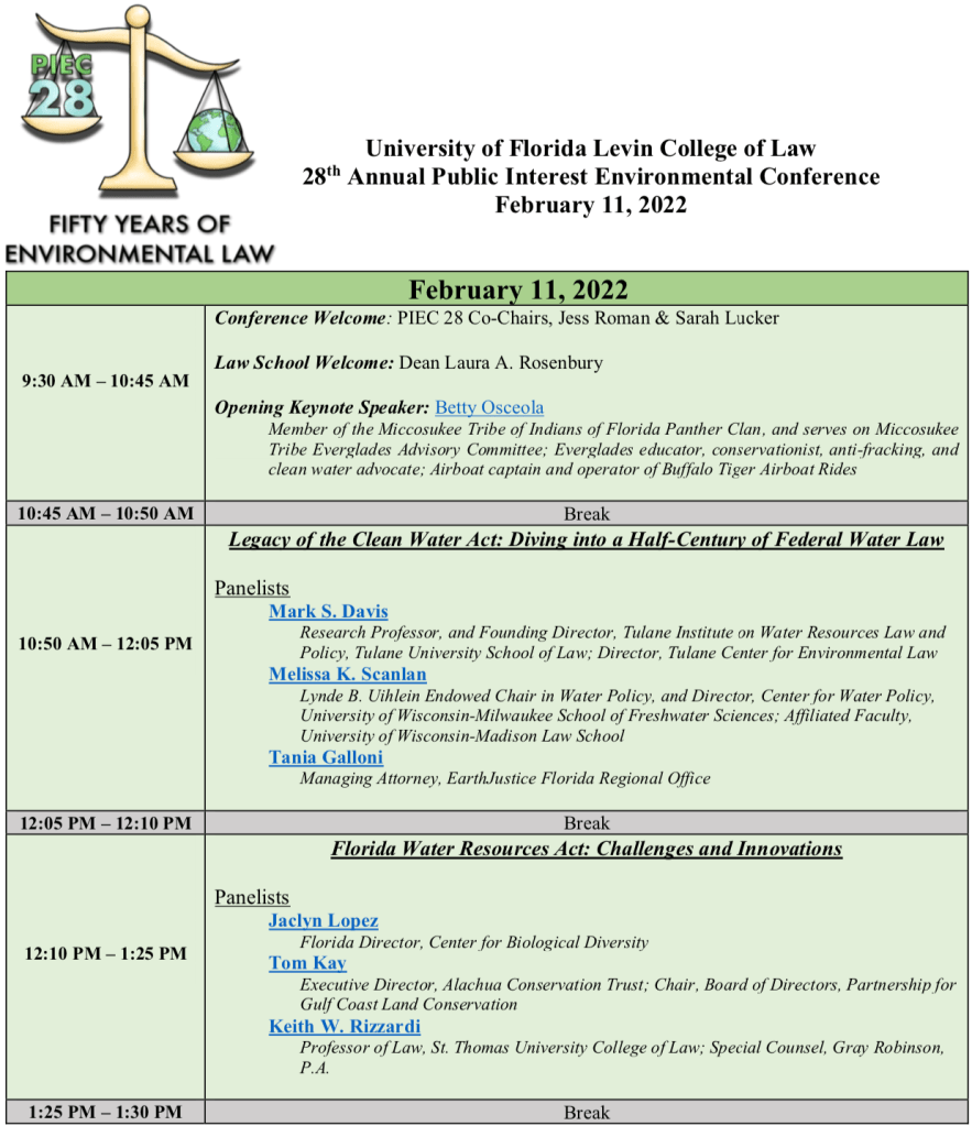 It has been fifty years since the establishment of many landmark environmental statutes and agencies. The early to mid-1970s saw the creation of the US Environmental Protection Agency and Florida Department of Regulation, which would later become the foundation of what is now the Florida Department of Environmental Protection. PIEC 28 will critically analyze this golden age of American environmental policy with a strong focus on the modern applicability and potency of statues that all share 50th anniversaries in the year 2022. We will also explore environmentalism in an international context, paying special attention to global cooperation since the 1972 United Nations Conference on the Human Environment.